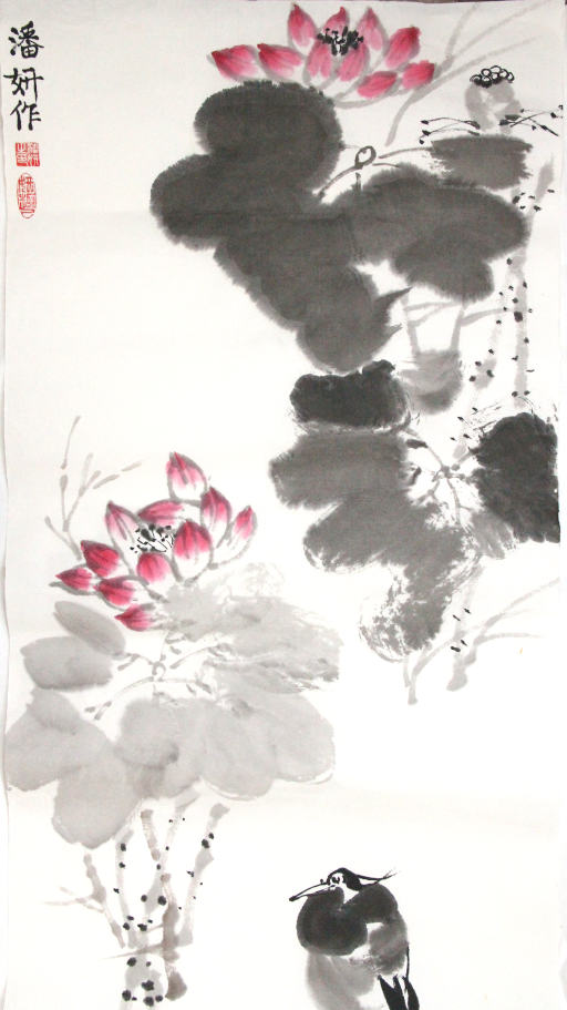 Drawn vertically upon a long length of traditional paper our artist has used the large free hand style with a mineral based black ink to draw out the larger features of lotus plants, while a smaller brush has rendered detail and natural lifelike poise to the egret.
