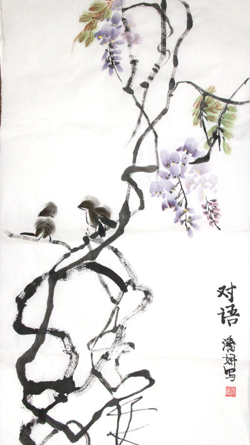 A beautiful scene drawn upon a long vertical stretch of arts paper, suiting the long vine of wisteria, this composition as with many traditional works carries meaning carried from the natural composition of the scene and connected relationships of the forms within.
